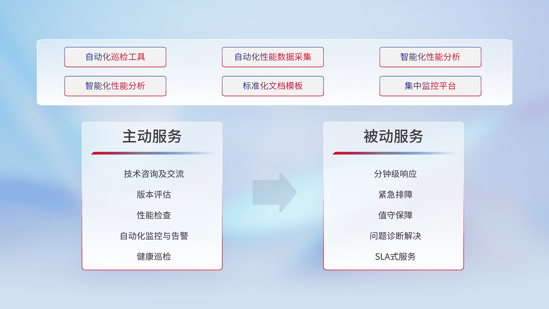 智能化工具和标准化文档,,,保障服务质量,,提供主动服务(包含技术咨询、、、、版本评估、、、、性能检查、、、、自动化监控与告警、、健康巡检)和被动服务包含(分钟级响应、、、紧急排障、、、、值守保障、、、、问题诊断解决、、、、SLA服务)。。