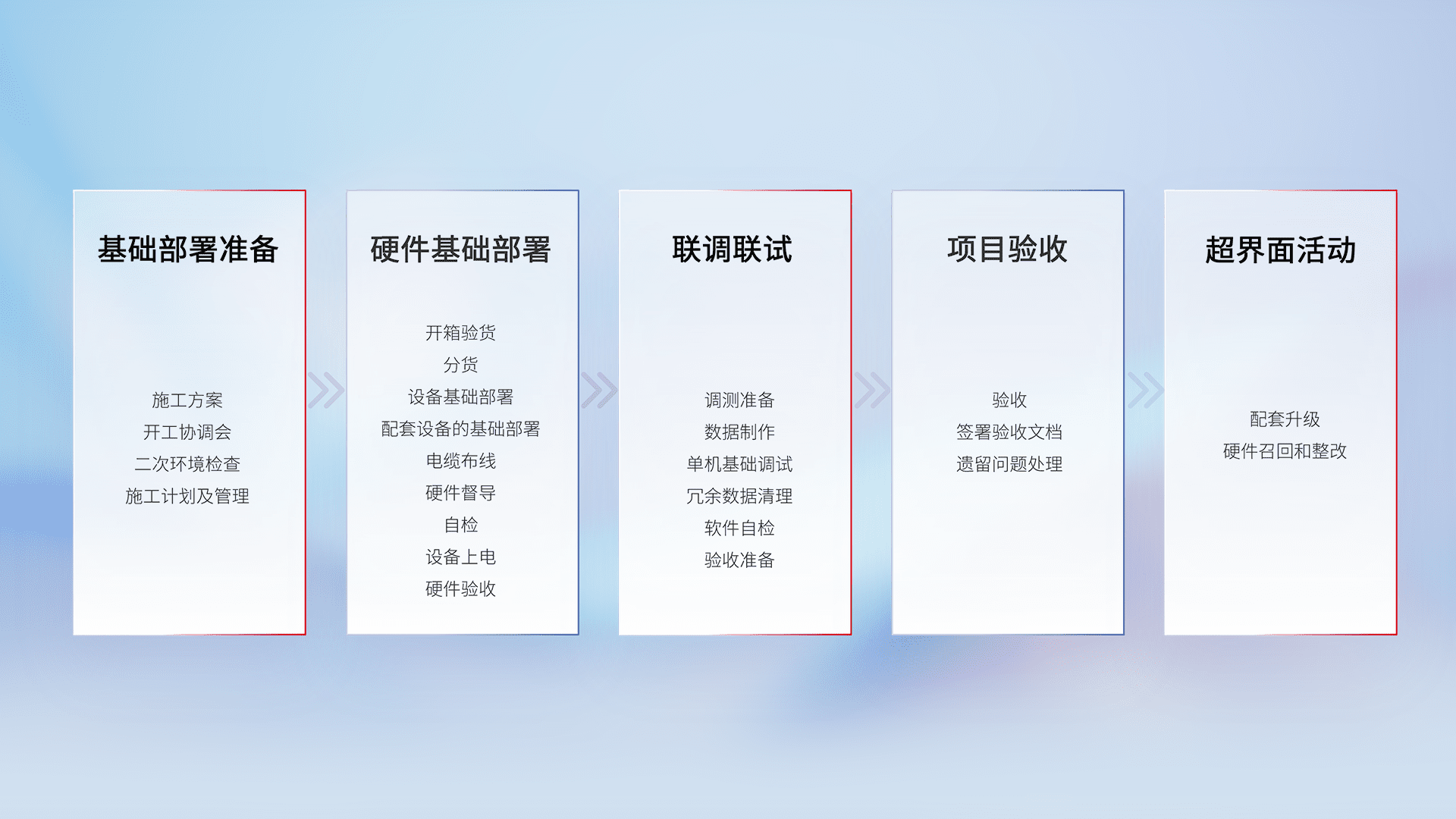从基础部署准备、、、硬件基础部署、、联调联试、、、、项目验收、、、、越界面活动的全过程可追溯,,保证施工质量和进度。。