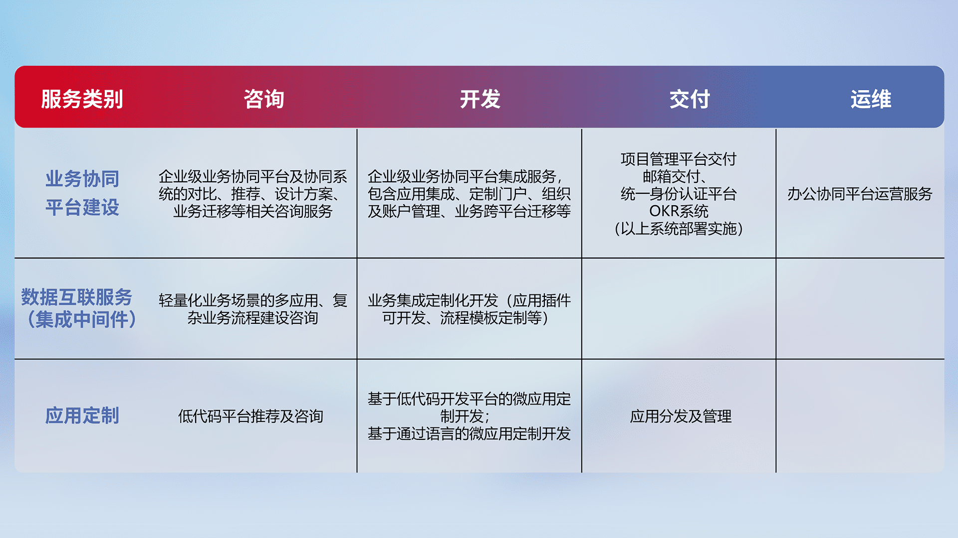 针对钉钉、、、、企微、、、、IDaas等平台级产品提供产品的规划、、、方案、、交付、、定制化开发等服务,,实现如统一协同办公、、智能客户服务、、、、混合会议管理、、智能数据查询、、、等业务场景,,,,实现数字化转型。。。